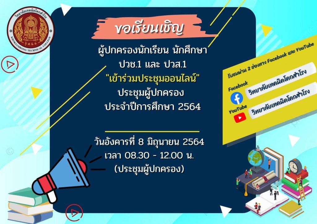 ประชาสัมพันธ์ผู้ปกครอง และนักเรียน นักศึกษา วิทยาลัยเทคนิคโคกสำโรง ระดับชั้น ปวช.1 และ ปวส.1 เข้ารับชมประชุมผู้ปกครอง ประจำปีการศึกษา 2564 ในวันอังคารที่ 8 มิถุนายน 2564