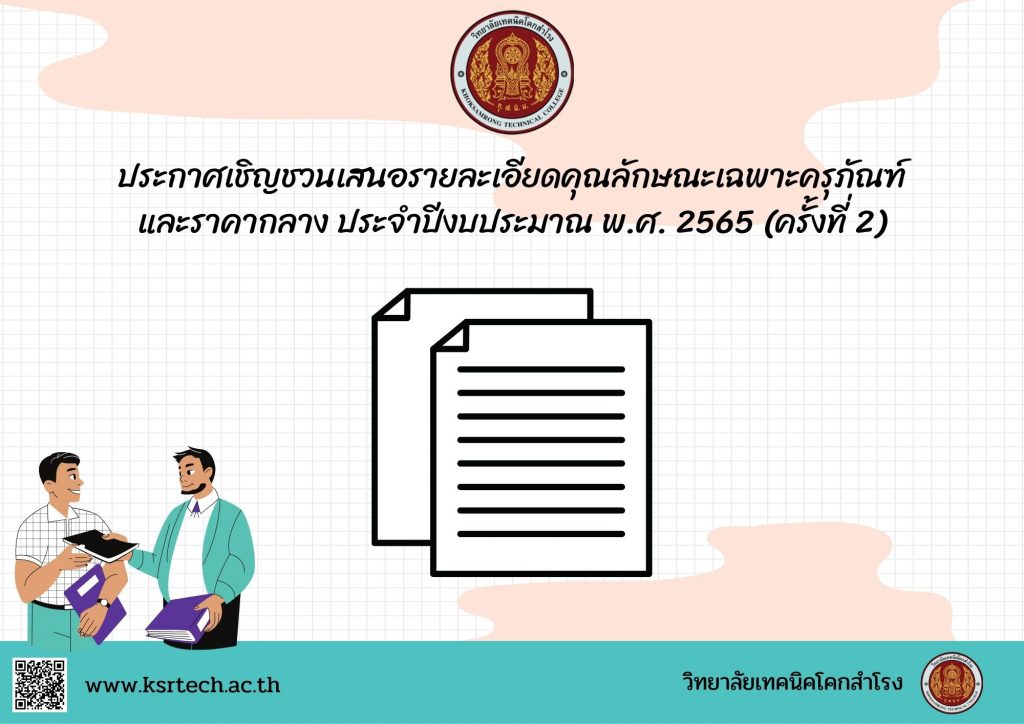 ประกาศเชิญชวนเสนอรายละเอียดคุณลักษณะเฉพาะครุภัณฑ์ และราคากลาง ประจำปีงบประมาณ พ.ศ. 2565 (ครั้งที่ 2) Leave a Comment / ข่าววิทยาลัยฯ / By adminksr ประกาศเชิญชวนเสนอรายละเอียดคุณลักษณะเฉพาะครุภัณฑ์ และราคากลาง ประจำปีงบประมาณ พ.ศ. 2565 (ครั้งที่ 2) จำนวนคนดู: 5
