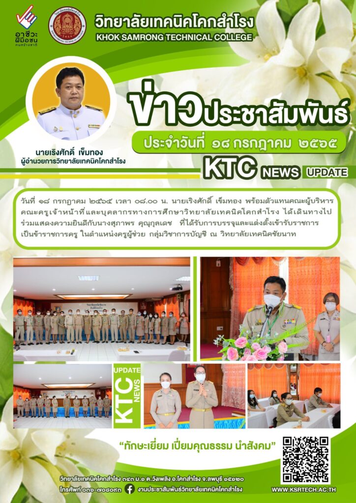 วิทยาลัยเทคนิคโคกสำโรง ได้เดินทางร่วมแสดงความยินดีกับครูผู้ช่วยคนใหม่ นางสุภาพร คุณุกุลเดช ณ วิทยาลัยเทคนิคชัยนาท / ข่าววิทยาลัยฯ / By adminksr จำนวนคนดู: 16