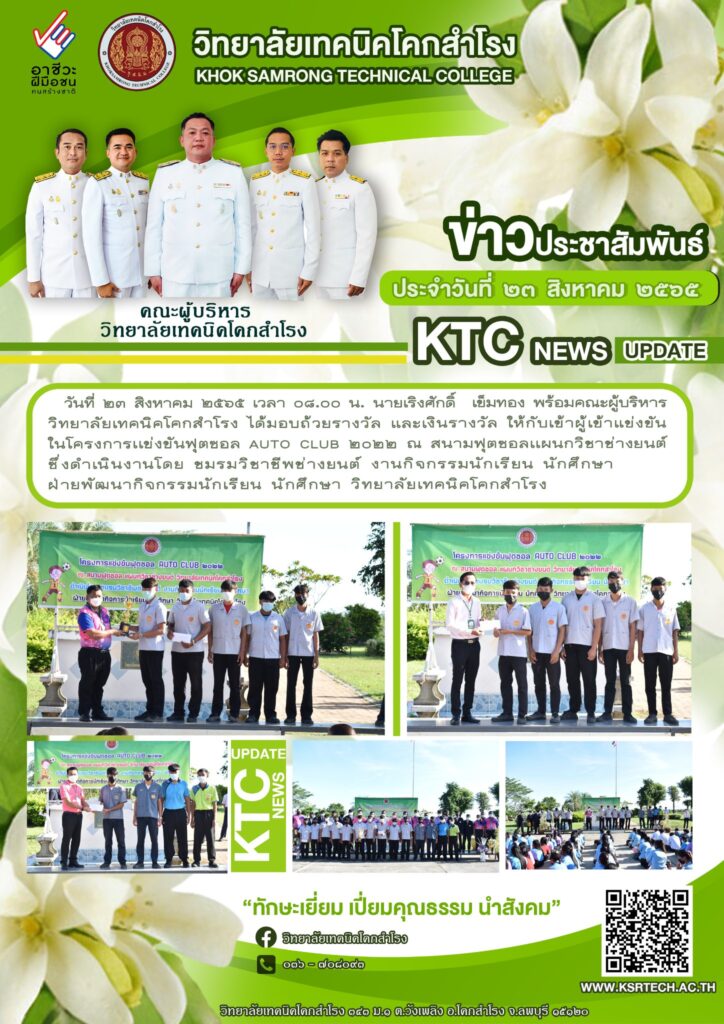 วันที่ ๒๓ สิงหาคม ๒๕๖๕ เวลา ๐๘.๐๐ น. นายเริงศักดิ์ เข็มทอง พร้อมคณะผู้บริหาร วิทยาลัยเทคนิคโคกสำโรง ได้มอบถ้วยรางวัล และเงินรางวัล ให้กับเข้าผู้เข้าแข่งขัน ในโครงการเเข่งขันฟุตซอล AUTO CLUB ๒๐๒๒ ณ สนามฟุตซอลเเผนกวิชาช่างยนต์ ซึ่งดำเนินงานโดย ชมรมวิชาชีพช่างยนต์ งานกิจกรรมนักเรียน นักศึกษาฝ่ายพัฒนากิจกรรมนักเรียน นักศึกษา วิทยาลัยเทคนิคโคกสำโรง / ข่าววิทยาลัยฯ / By adminksr จำนวนคนดู: 3