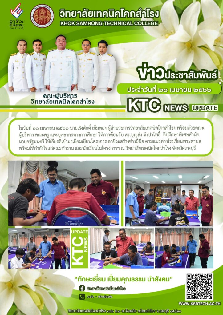 ในวันที่ ๒๐ เมษายน ๒๕๖๖ นายเริงศักดิ์ เข็มทอง ผู้อำนวยการวิทยาลัยเทคนิคโคกสำโรง พร้อมด้วยคณะผู้บริหาร คณะครู และบุคลากรทางการศึกษา ให้การต้อนรับ ดร.บุญส่ง จำปาโพธิ์ ที่ปรึกษาพิเศษสำนักนายกรัฐมนตรี ให้เกียรติเข้ามาเยี่ยมเยียนโครงการ อาชีวะสร้างช่างฝีมือ ตามแนวทางโรงเรียนพระดาบส พร้อมให้กำลังใจแก่คณะทำงาน และนักเรียนในโครงการฯ ณ วิทยาลัยเทคนิคโคกสำโรง จังหวัดลพบุรี